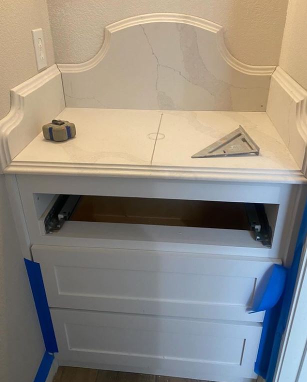RW Construction worked closely with the customer to create a design that fit their needs. The standalone sink was replaced with a custom-built vanity featuring three spacious drawers for storage. This new setup allowed for easy organization of essentials like guest towels, toiletries, and cleaning supplies.