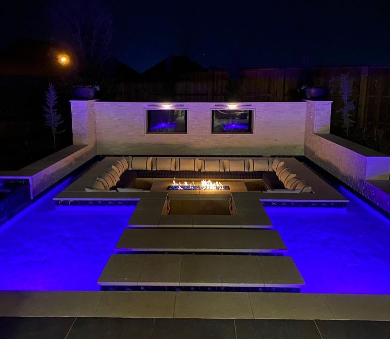 The result is a luxurious outdoor living area that combines elegance and functionality. The custom fire pit serves as the focal point, bringing warmth and ambiance to the space. The sunken seating area, paired with the soft glow of the LED lighting, offers a cozy retreat for gatherings or quiet evenings under the stars.